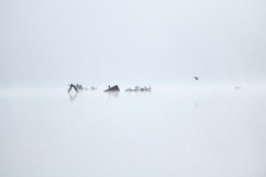 Uwe Langmann setzt in seinen minimalistischen Fotografien das japanische Prinzip „Mono no aware“ um – die Empfindsamkeit für das Vergängliche. Nebel, Wasserflächen und Horizonte werden so eingefangen, dass das Vergehende selbst zum Motiv wird. In der Serie „Murmuration“ widmet sich Langmann dem Phänomen des Schwarmverhaltens von Vögeln, die sich im Zusammenspiel zu einer fließenden Form verbinden. So transformiert er das Naturereignis in ein Bildfeld von Fluktuation und Stille zugleich. Seine lange Belichtungszeit sowie die gezielte Reduktion des Motivs erlauben eine Rücknahme der konkreten Formen – nicht etwa zur Abstraktion im üblichen Sinne, sondern zur Offenlegung eines Raums, in dem Wahrnehmung und Erinnerung aktiv werden. Die Fotografien wirken nicht schlicht als Abbilder, sondern als Orte der Reflexion, in denen sich das Sichtbare in das Unsichtbare verschiebt.